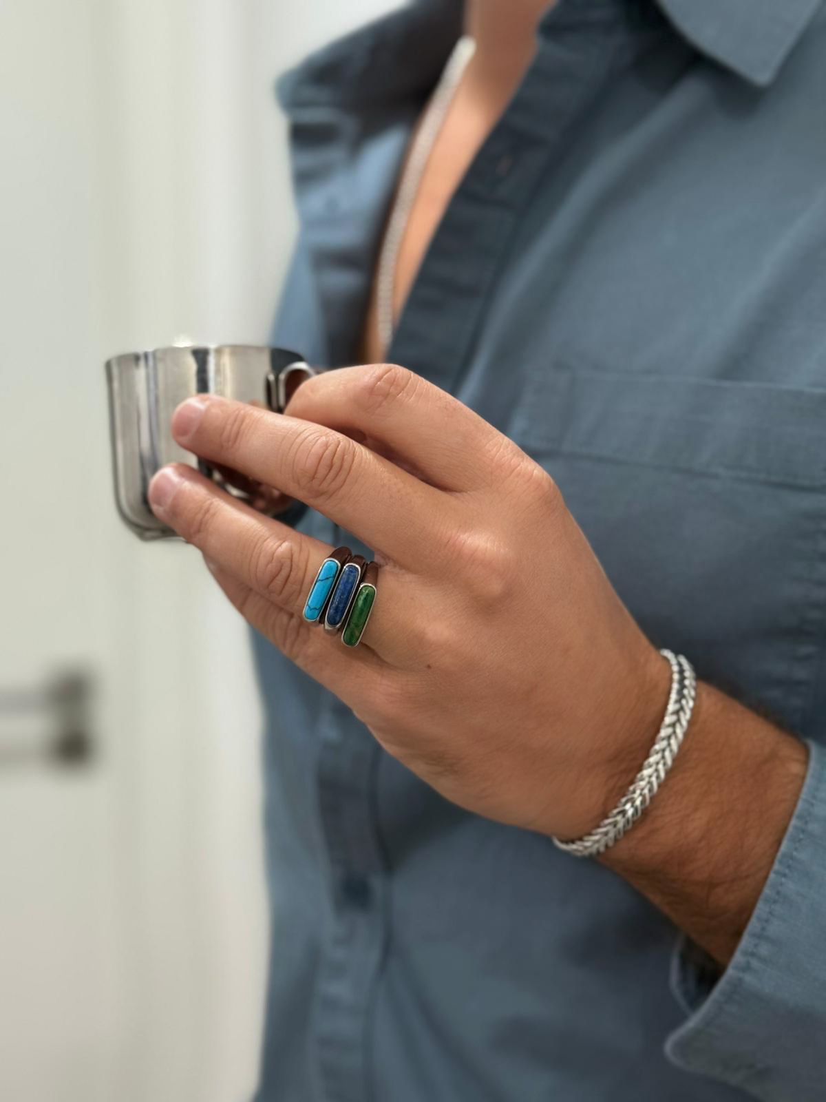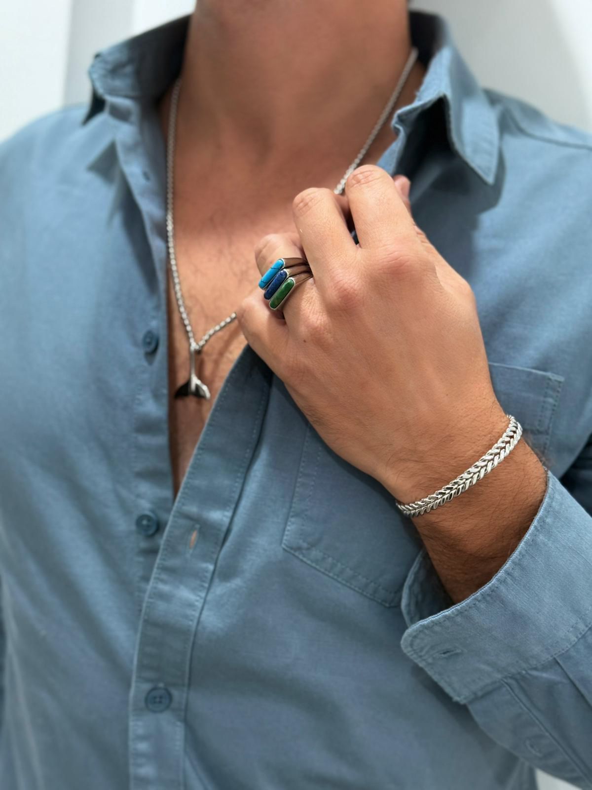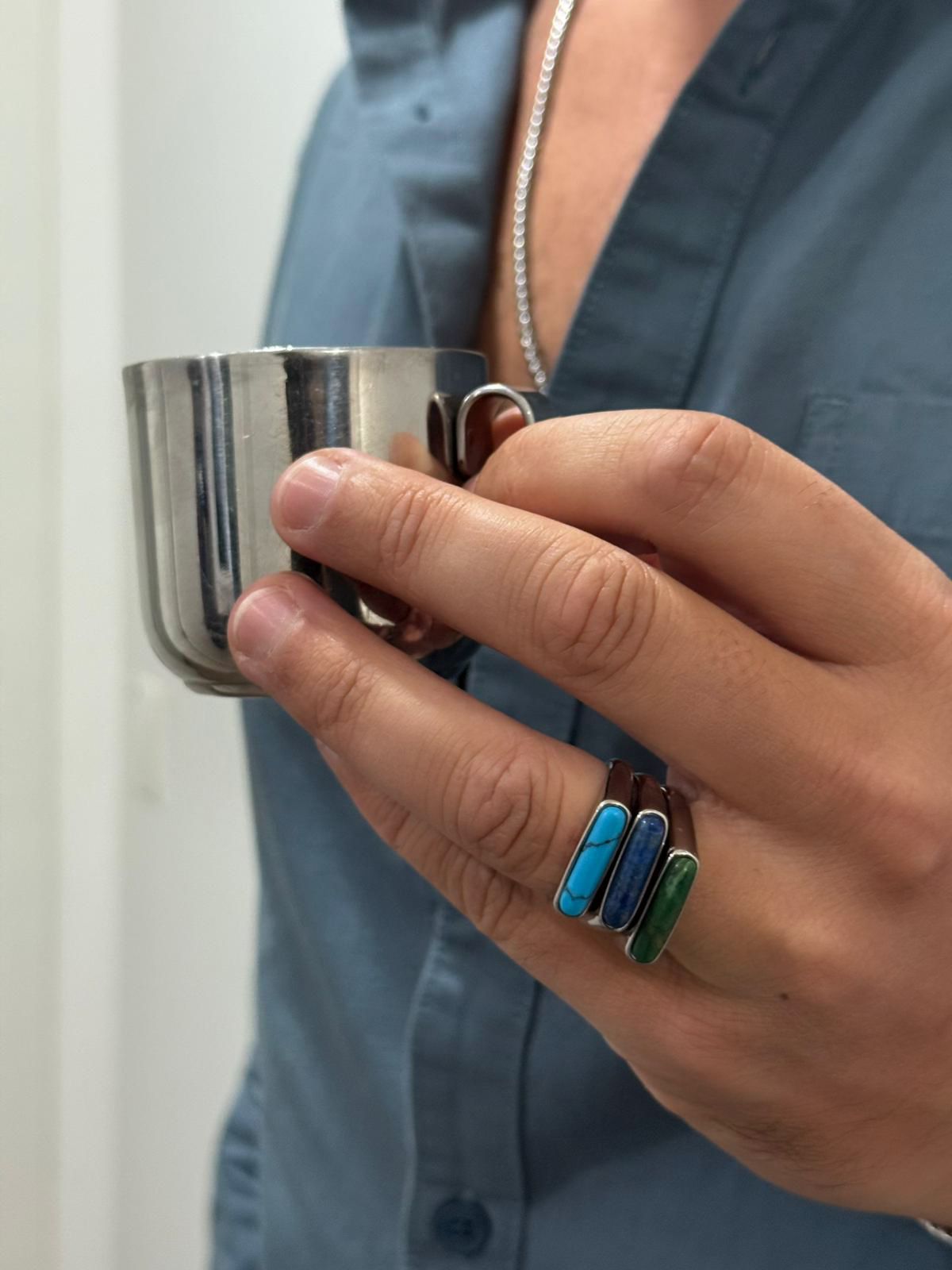 Cada anel é trabalhado em aço inoxidável prateado com uma pedra colorida em forma alongada, trazendo um toque moderno e cheio de personalidade.