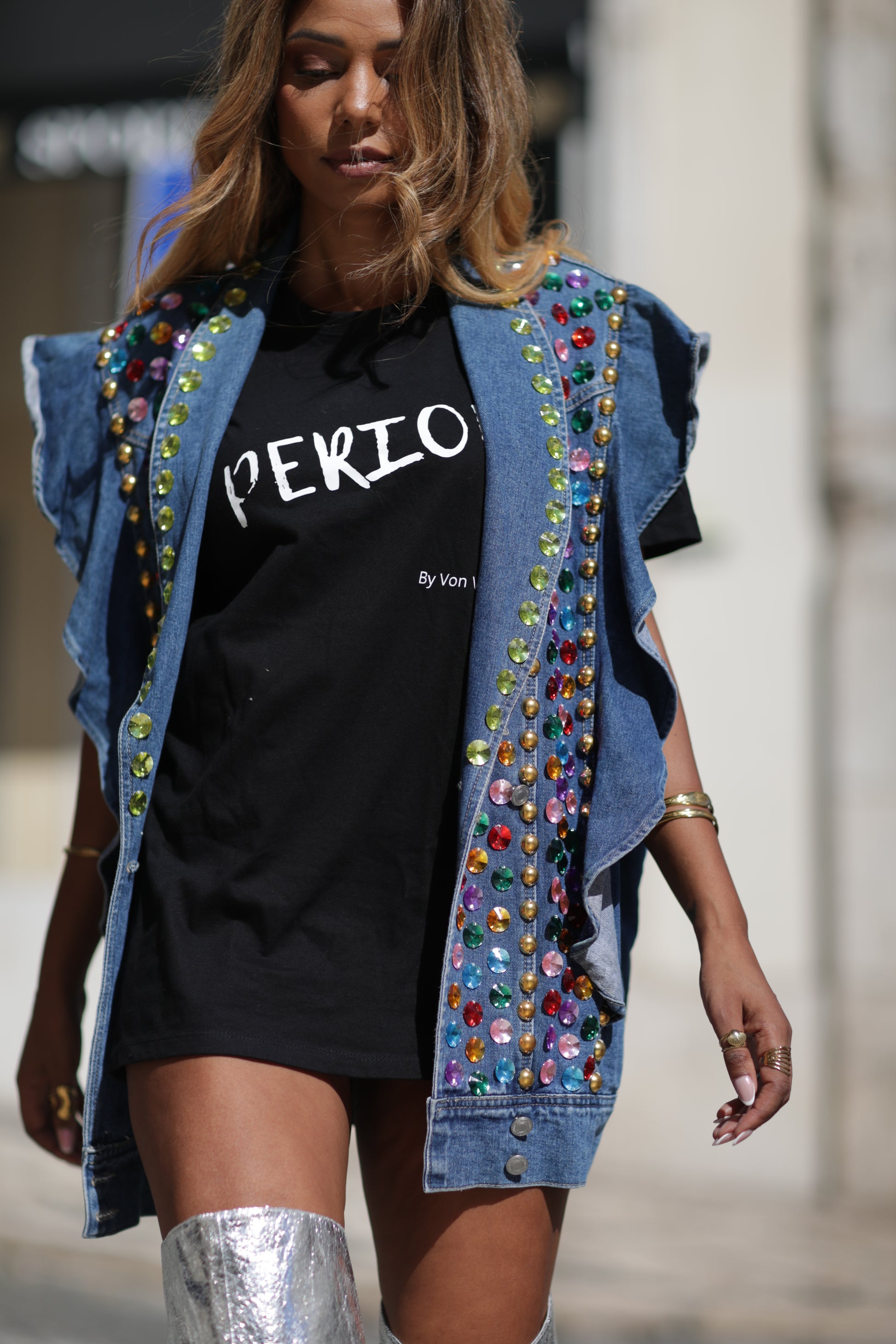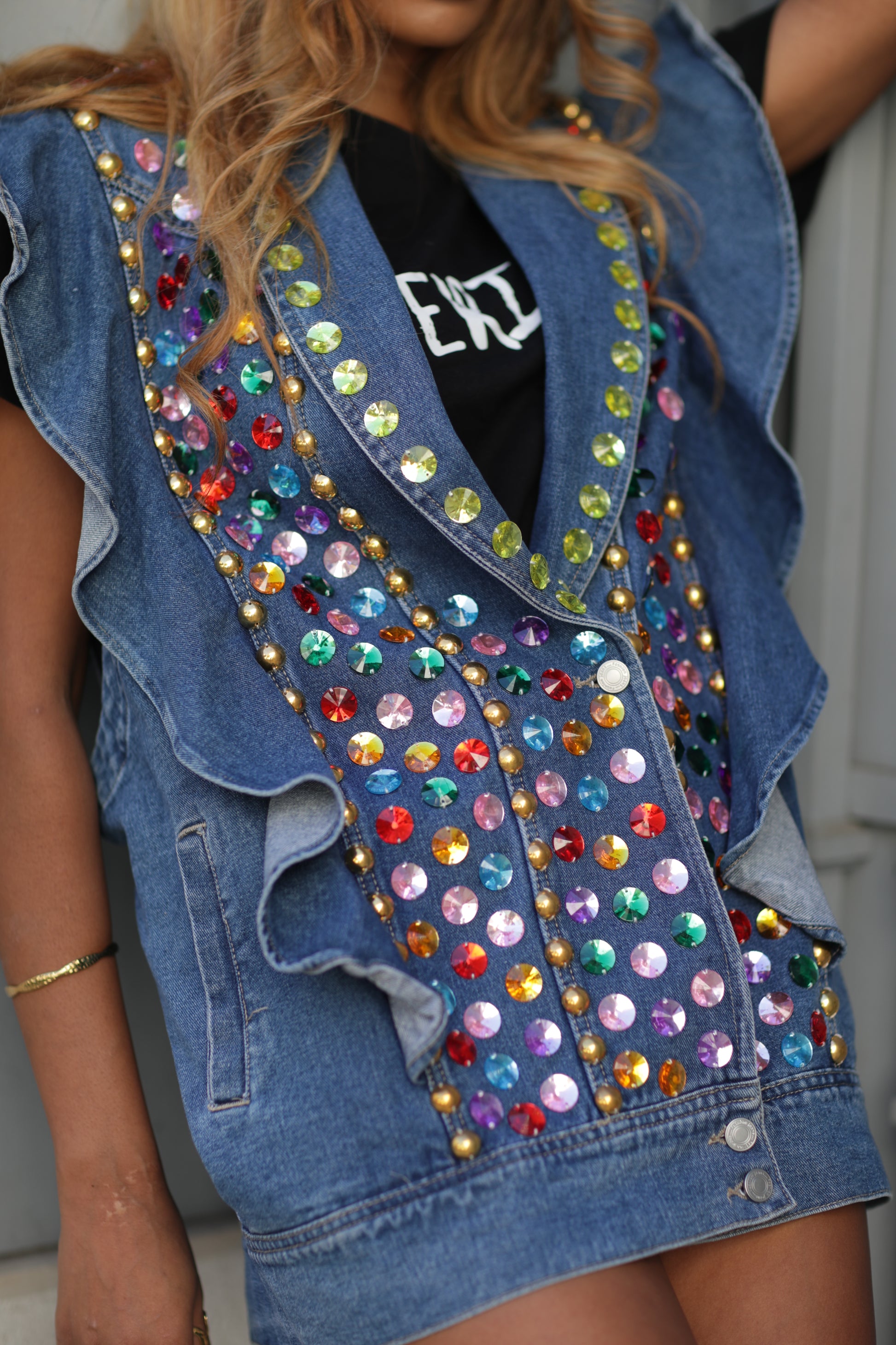 Dá um upgrade instantâneo ao teu look com este colete de ganga cheio de personalidade. As pedras coloridas acrescentam um detalhe original e elegante, tornando-o a peça statement perfeita para qualquer ocasião do casual ao mais ousado.